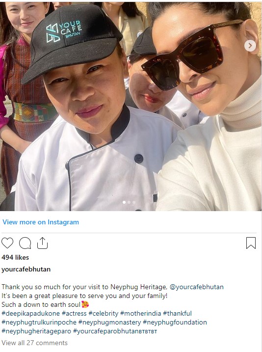 रिपोर्ट्स के मुताबिक, एक्ट्रेस पिछले हफ्ते किंगडम ऑफ भूटान में थीं, जहां उन्होंने दर्शनीय स्थलों की यात्रा की और लोकप्रिय कैफे का दौरा भी किया।पादुकोण ने नेफग हेरिटेज के लोकप्रिय योर कैफे का दौरा किया – 3-मंजिला परिसर जो नेफग मठ का एक हिस्सा है। प्रशंसकों और शेफ के साथ अभिनेत्री की सेल्फी साझा करते हुए, कैफे के आधिकारिक इंस्टाग्राम प्रोफाइल पर पोस्ट में लिखा था, “नेफग हर में आपकी यात्रा के लिए बहुत-बहुत धन्यवाद..