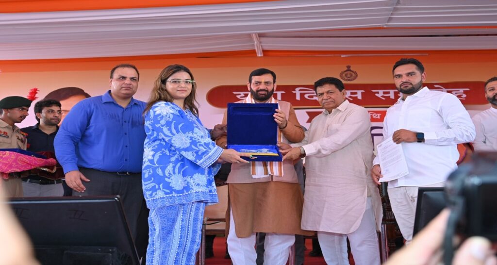 फोटो केप्सन :1- हरियाणा मुख्यमंत्री नायब सिंह सैनी AVPL International संस्थापक व निदेशक प्रीत संधू को स्मृति चिन्ह भेट करतें हुए